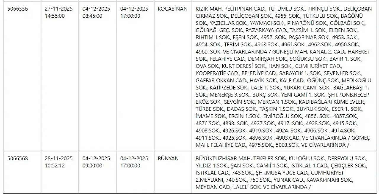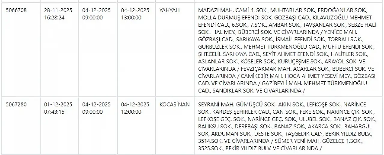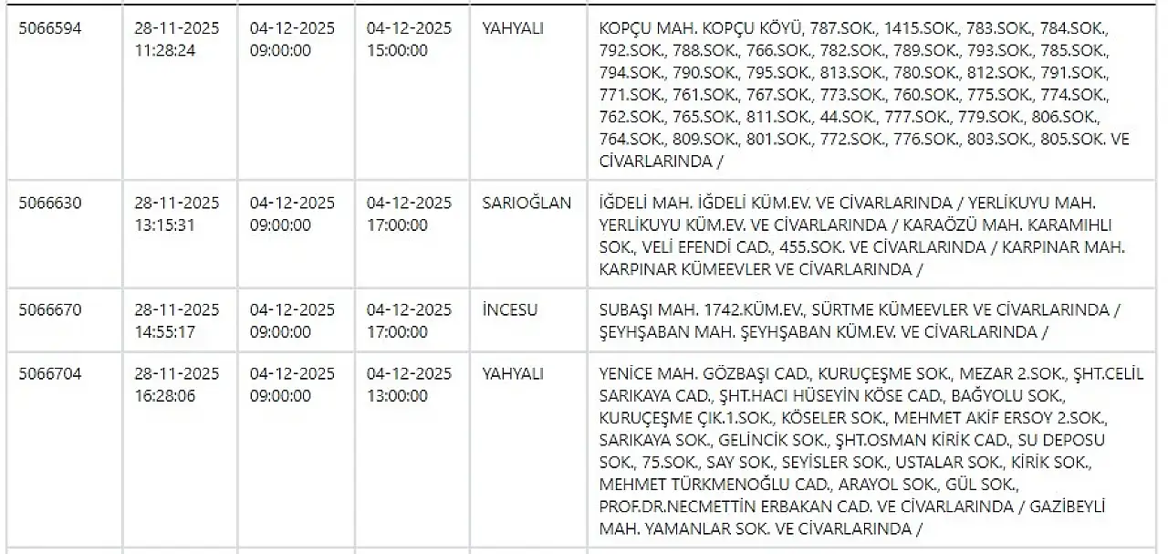 KCETAŞ’tan edinilen bilgilere göre yarın (4 Aralık 2025) aşağıdaki mahallelerde elektrik kesintisi yaşanacak.