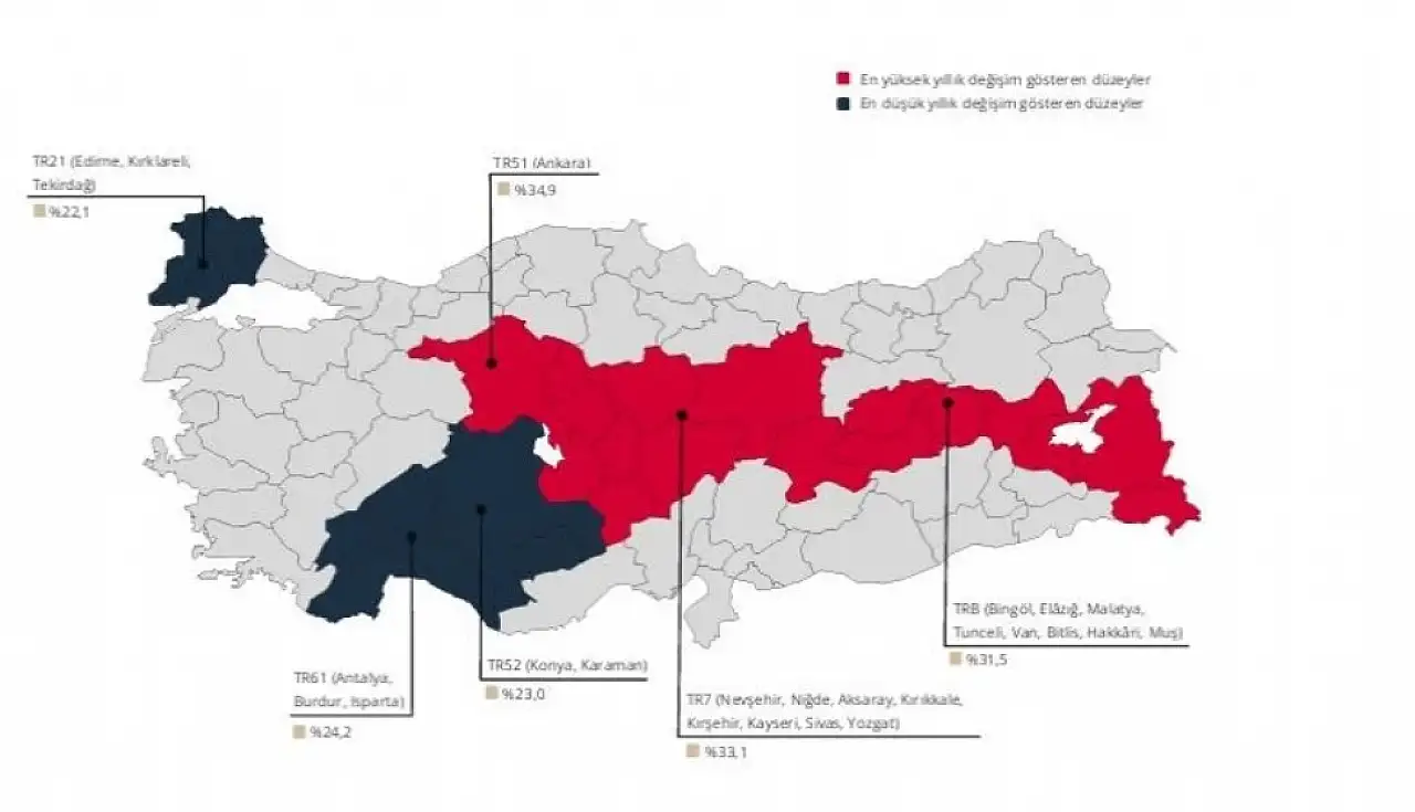 Açıklanan haritaya göre Kayseri’nin de içinde bulunduğu TR71 bölgesi, yıllık konut fiyat artışının en yüksek olduğu bölgeler arasında yer aldı. Kayseri ile birlikte Nevşehir, Niğde, Aksaray, Kırşehir, Sivas ve Yozgat’ı kapsayan TR71 bölgesi kırmızı renkle gösterilirken, bu bölgede yıllık konut fiyat artışının yaklaşık yüzde 33 seviyesinde gerçekleştiği görüldü.