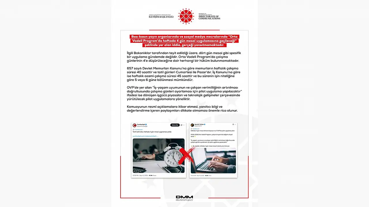 DMM'den yapılan açıklamaya gör : ‘’Bazı basın yayın organlarında ve sosyal medya mecralarında “Orta Vadeli Program’da haftada 4 gün mesai uygulamasına geçileceği” şeklinde yer alan iddia, gerçeği yansıtmamaktadır.'' denildi.