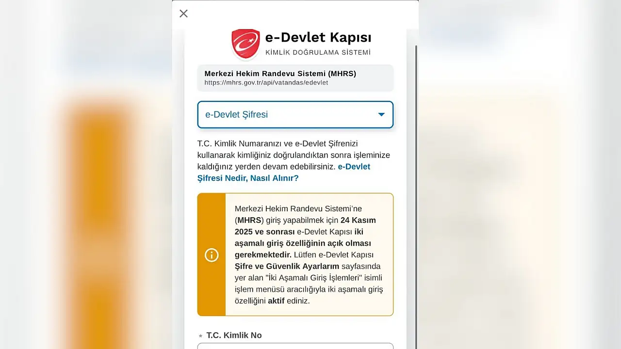 MHRS sistemi üzerinde yer alan uyarı metninde: ‘Merkezi Hekim Randevu Sistemi’ne (MHRS) giriş yapabilmek için 24 Kasım 2025 ve sonrası e-Devlet Kapısı iki aşamalı giriş özelliğinin açık olması gerekmektedir. Lütfen e-Devlet Kapısı Şifre ve Güvenlik Ayarlarım sayfasında yer alan İki Aşamalı Giriş İşlemleri isimi işlem menüsü aracılığı ile iki aşamalı giriş özelliğini aktif ediniz’ ifadeleri yer alıyor.