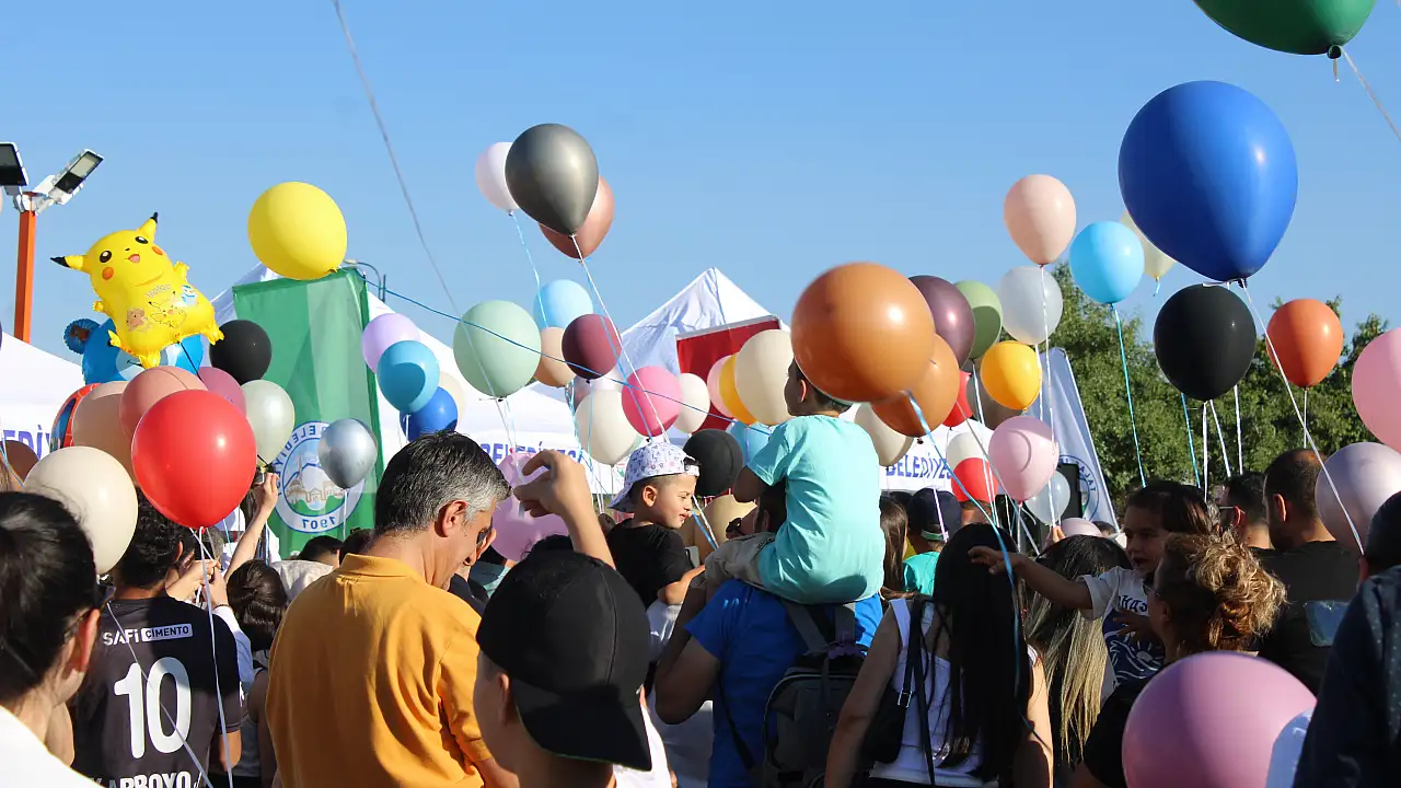 Çocukların çeşitli oyunlar oynayarak birbirleriyle yarıştığı etkinlikte rengarenk yüzlerce balon gökyüzüne bırakıldı.