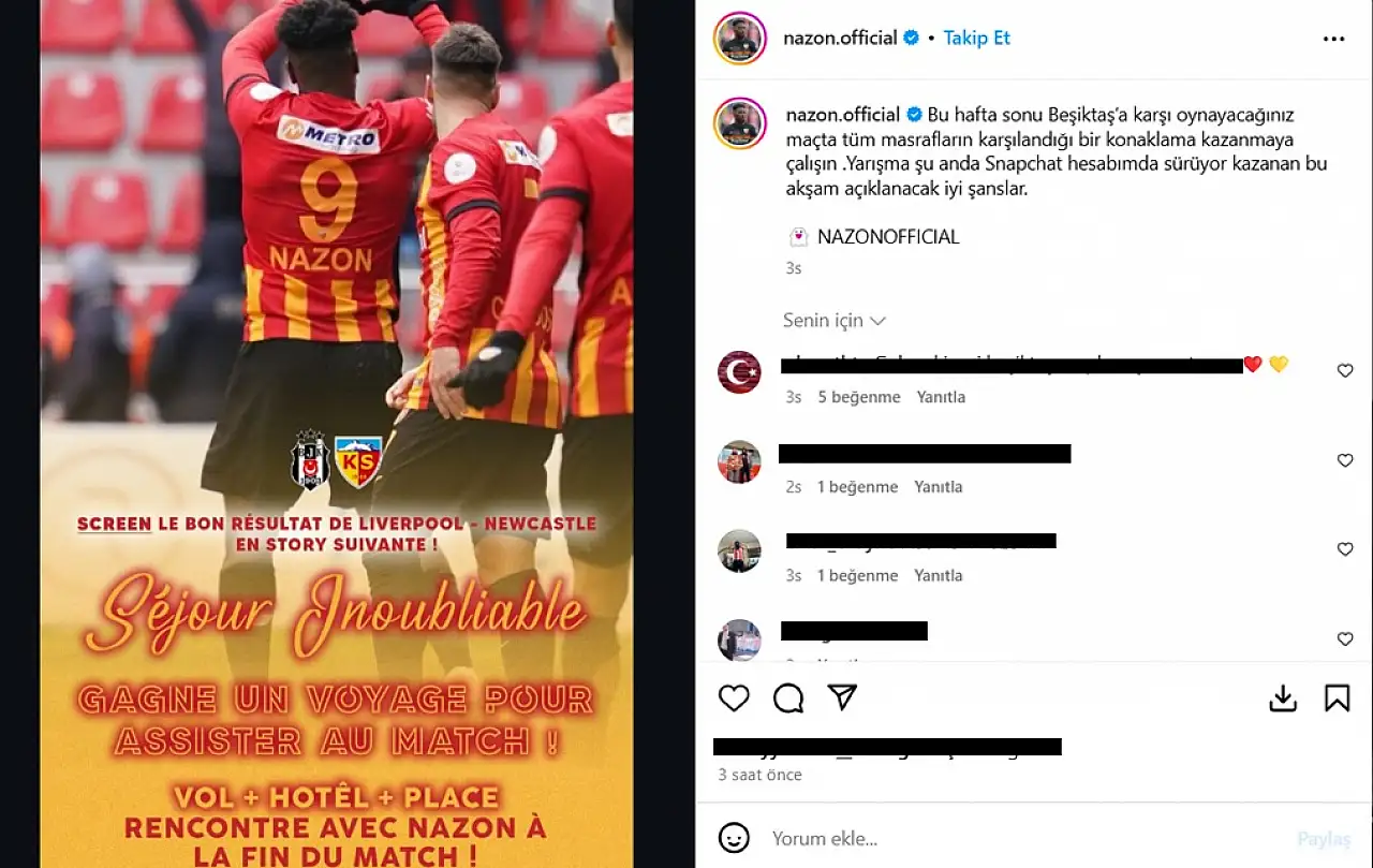 Bellona Kayserispor’da ikinci yarı ile birlikte kendini bulan Nazon, son 5 maçta ağları 4 kez sarstı. Sarı-kırmızılı ekibin çıkışında önemli pay sahibi olan Nazon, taraftara özel bir çekiliş düzenledi. Bu çekilişi de sosyal medya hesaplarından duyurdu.