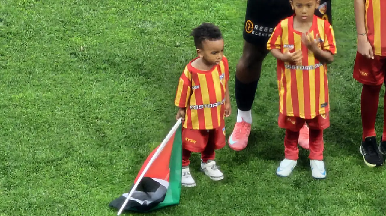 Kayserispor'un Haitili forveti Duckens Nazon, Kayserispor Bodrumspor maçına oğluyla birlikte çıktı. Minik oğlunun elindeki Filistin Bayrağı dikkat çekti.