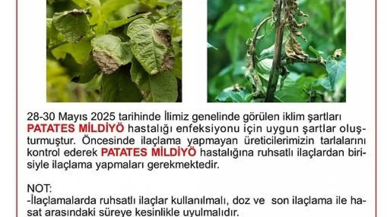 Niğde İl Tarım ve Orman Müdürlüğü, 28-30 Mayıs 2025 tarihleri arasında kent genelinde etkili olan sağanak yağışların, patates bitkilerinde yaygın görülen mildiyö hastalığı için uygun ortam oluşturduğunu belirterek üreticileri uyardı.