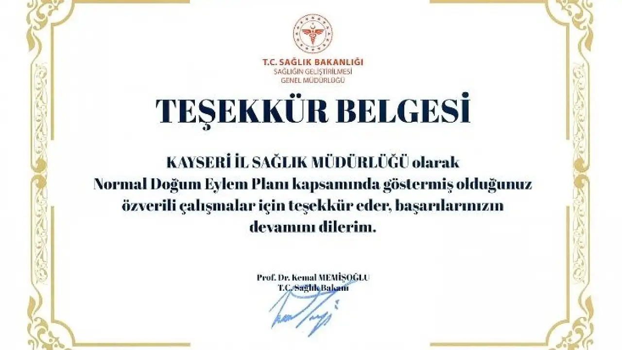 Kayseri İl Sağlık Müdürlüğü, normal doğum hizmetlerindeki başarısıyla Sağlık Bakanlığı tarafından teşekkür belgesiyle ödüllendirildi. Detaylar Kayseri Anadolu Haber'de...