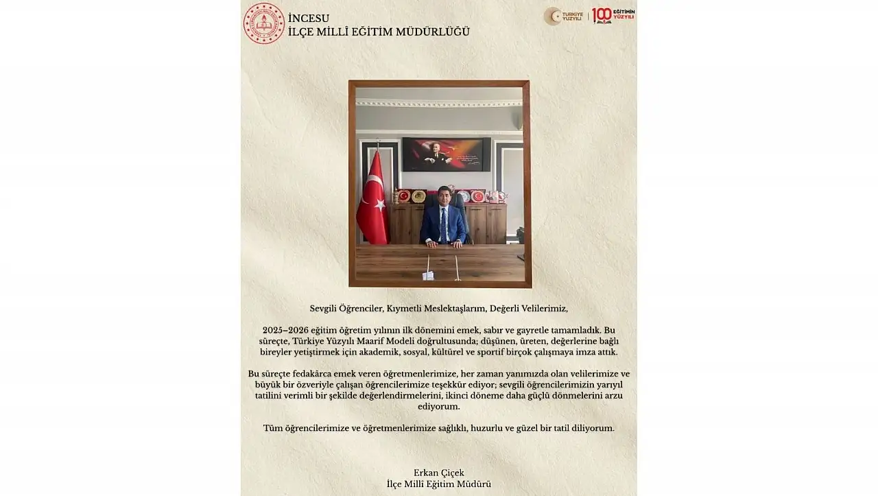 İncesu İlçe Milli Eğitim Müdürü Erkan Çiçek karne günü olması dolayısıyla mesaj yayımladı. Çiçek, gençlerden beklentisini söyledi.