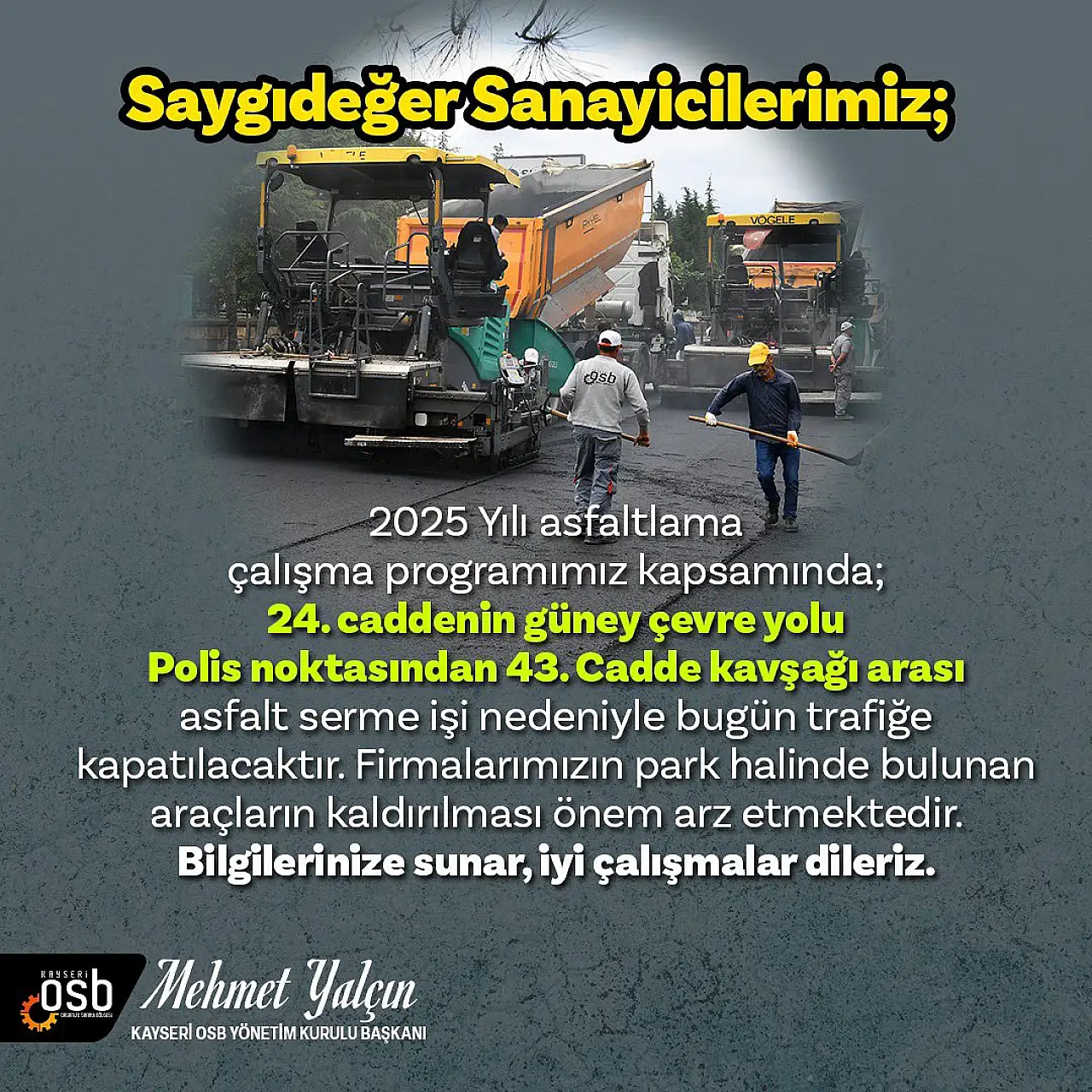 Kayseri OSB’den yapılan açıklamada şu ifadelere yer verildi, ‘Saygıdeğer Sanayicilerimiz; 2025 Yılı asfaltlama çalışma programımız kapsamında; 24. caddenin güney çevre yolu Polis noktasından 43. Cadde kavşağı arası asfalt serme işi nedeniyle bugün trafiğe kapatılacaktır. Firmalarımızın park halinde bulunan araçların kaldırılması önem arz etmektedir. Bilgilerinize sunar, iyi çalışmalar dileriz’
