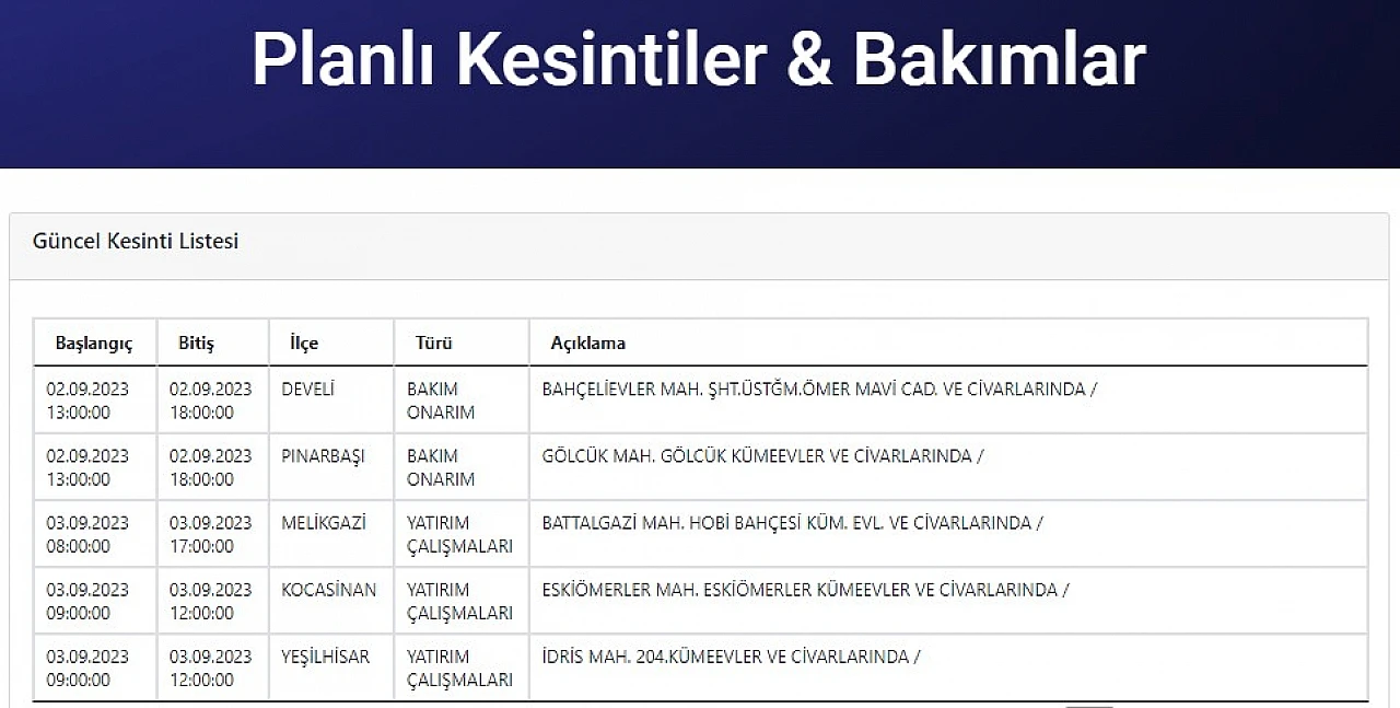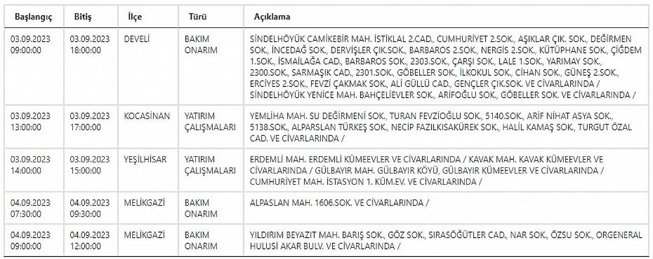 - Önleminizi alın, Kayseri için duyuru yapıldı- Elektrik kesintisi yapılacak! 3 Eylül 2023