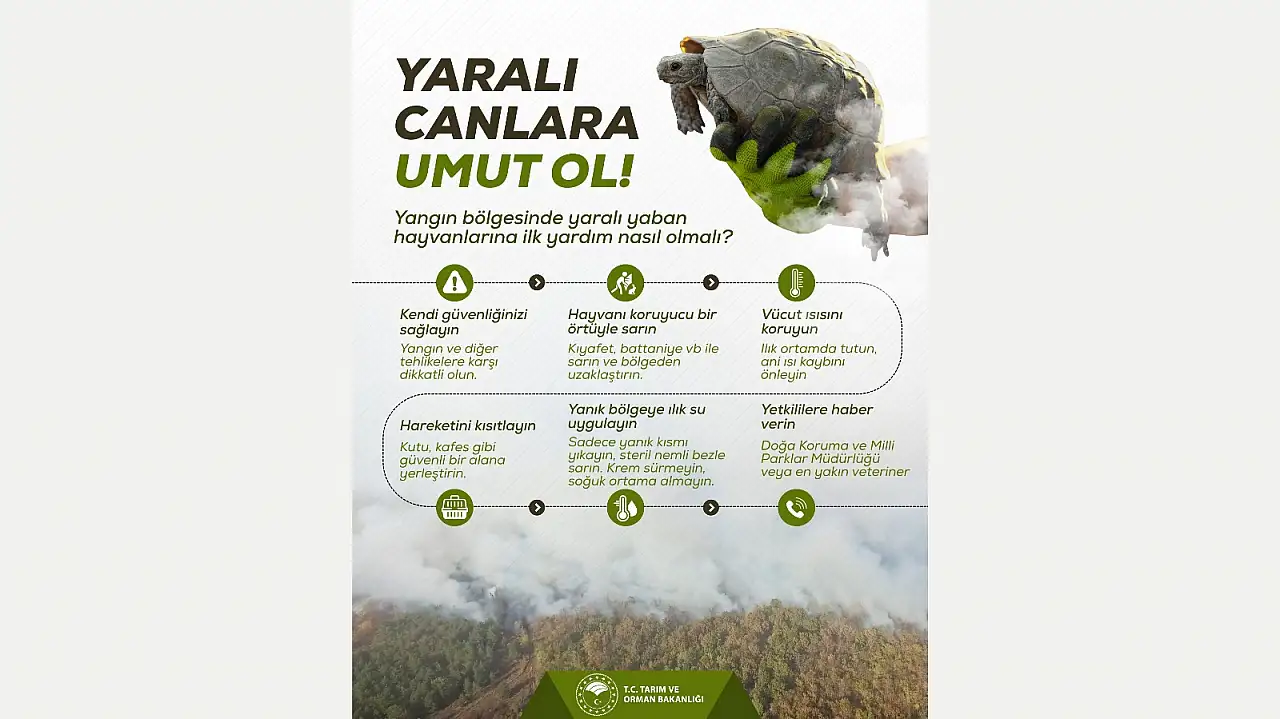 Tarım ve Orman Bakanlığı sosyal medya hesabı üzerinden yaptığı paylaşımlarla vatandaşları bilinçlendiriyor. Bu doğrultuda yangın bölgelerinde yaralanan yaban hayvanlarının doğru şekilde kurtarılması konusunda vatandaşlara önemli uyarılarda bulunuldu. Doğru müdahalenin hayati önem taşıdığı belirtildi.