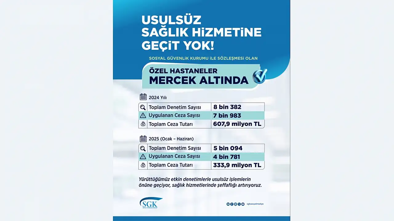 SGK ile anlaşması bulunan özel hastaneler üzerinde gerçekleştirilen denetimlerde 8 bin 382 denetim faaliyetinden usulsüzlük tespit edilen 7 bin 983 işletmeye 607 milyon 900 bin TL para cezası uygulandığı belirtildi.