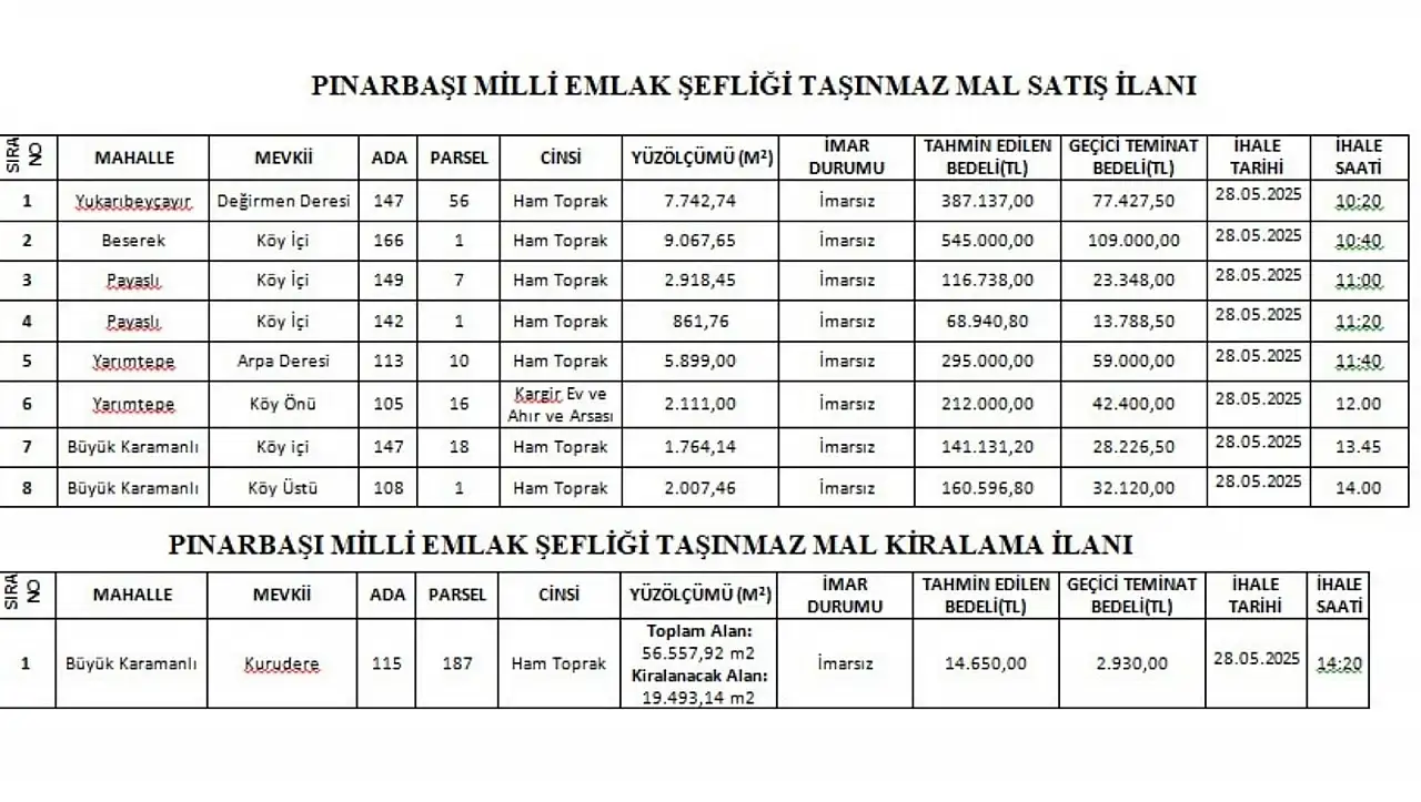 Pınarbaşı ilçesinde bulunan ve mülkiyeti Hazine’ye ait olan taşınmazların satışı, 2886 sayılı Devlet İhale Kanunu’nun 45. maddesi gereğince açık teklif usulüyle gerçekleştirilecek. Yukarıbeyçayır, Beserek, Payaslı, Yarımtepe ve Büyük Karamanlı mahallelerinde yer alan taşınmazlar arasında ham toprak ve kârgir yapı içeren parseller de bulunuyor.