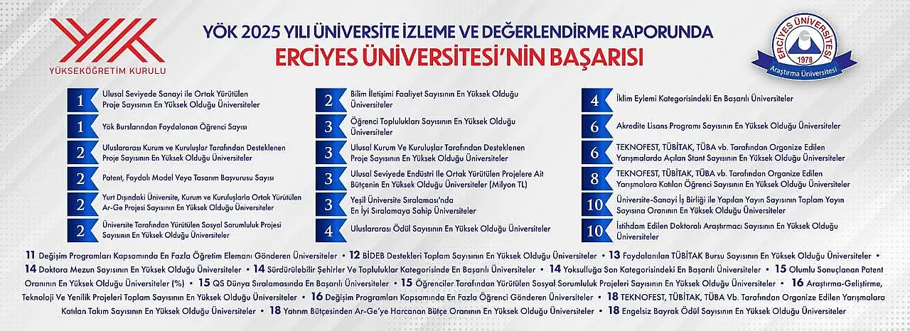 Erciyes Üniversitesi 2025 yılı Üniversite İzleme ve Değerlendirme Genel Raporu'nda 2 göstergede 1. Sırada yer aldı. Detaylar haberimizde…