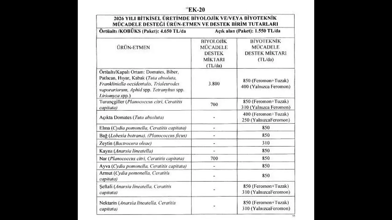 Yayımlanan düzenlemenin EK-20 tablosunda, biyolojik ve biyoteknik mücadele desteklerine ilişkin birim tutarlar da netleşti. Buna göre;