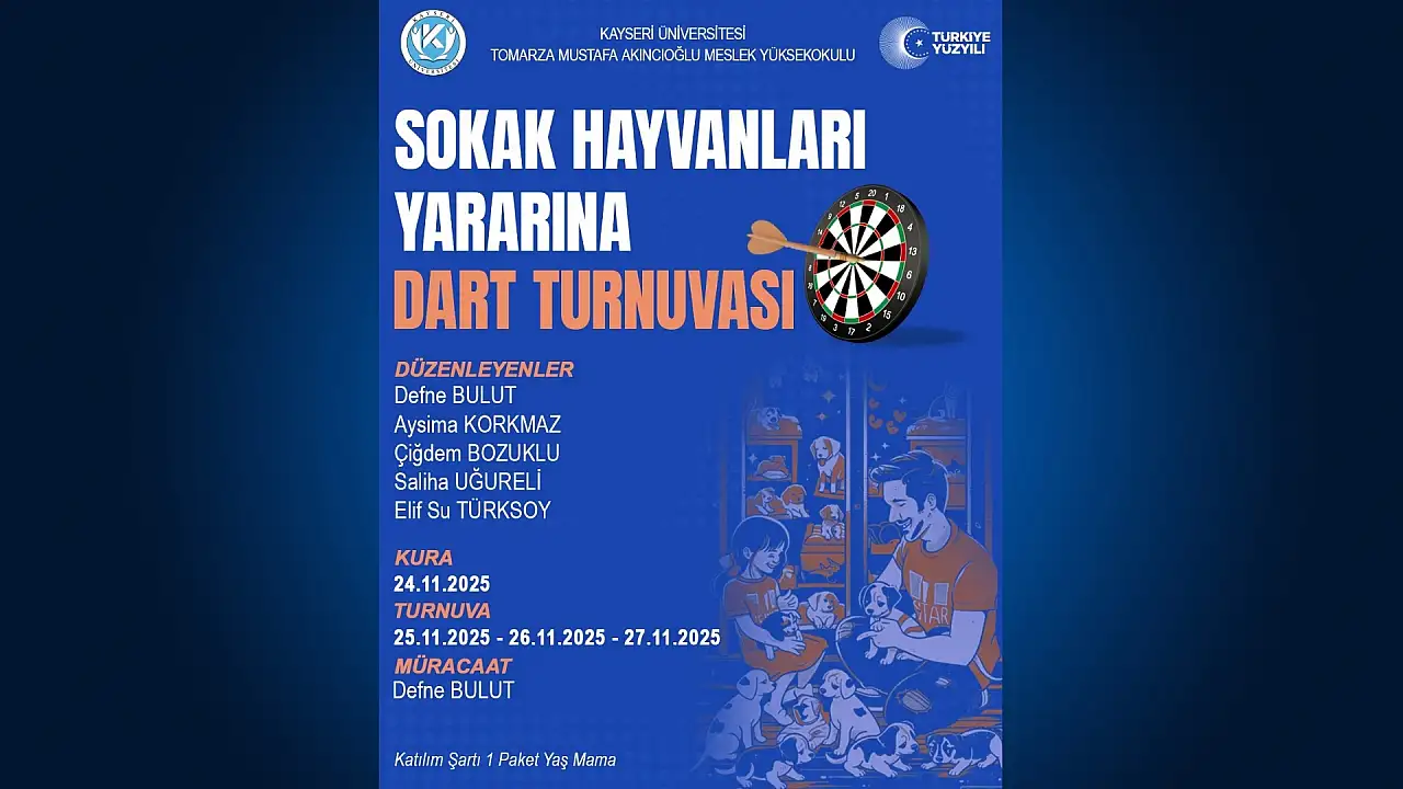 Kayseri Üniversitesi Tomarza Mustafa Akıncıoğlu Meslek Yüksekokulu, sokak hayvanlarına destek amacıyla dikkat çekici bir etkinlik düzenliyor. Öğrencilerin hazırladığı ‘Sokak Hayvanları Yararına Dart Turnuvası’ hem spor hem de dayanışma ruhunu bir araya getiriyor.