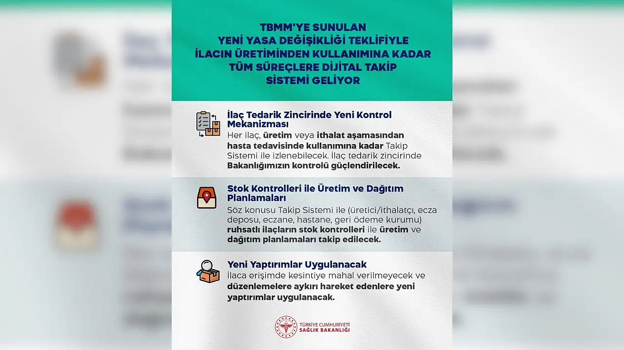 Sağlık Bakanlığı tarafından yapılan sosyal medya paylaşımına göre, TBMM’ye sunulan yeni kanun teklifleri birçok yeniliği beraberinde getiriyor. Kanun teklifi ile yasalaşması beklenen yeni düzenlemeye göre ilacın üretiminden son kullanımına kadar tüm süreçlere dijital takip sistemi ile kontrol edilebilecek.