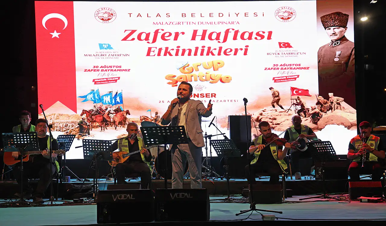 Talas Belediyesi’nin organize ettiği ‘‘Malazgirt’ten Dumlupınar’a Zafer Haftası Etkinlikleri’‘ Talas Millet Bahçesi’nde coşkuyla başladı. Grup Şantiye’nin sahne aldığı gecede vatandaşlar, söylenen şarkılara hep birlikte eşlik ederek unutulmaz anlar yaşadı.