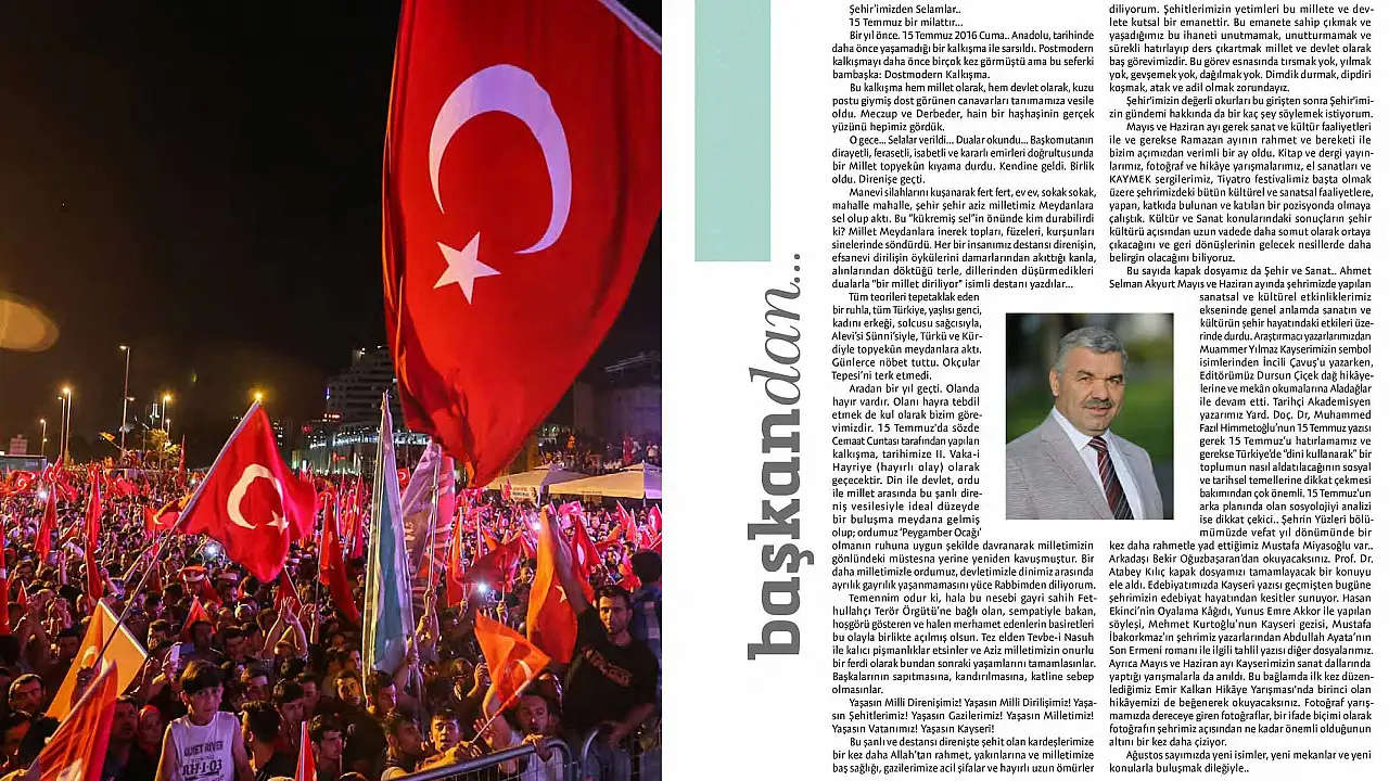 Büyükşehir Belediye Başkanı Mustafa Çelik, dergideki yazısında “15 Temmuz 2016’da yaşadığımı ihaneti asla unutmayacağız ve unutturmayacağız” dedi.