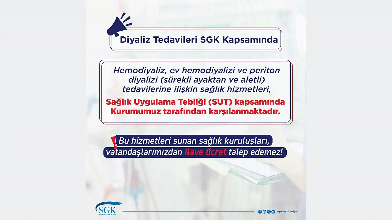 Yapılan paylaşımda sunulan diyaliz tedavilerinin Sağlık Uygulama Tebliği kapsamında olduğu ve kurum tarafından karşılığında bilgisi yer aldı. Bu hizmetleri sunan sağlık kuruluşlarının vatandaşlardan ilave ücret talep edemeyeceği belirtildi.