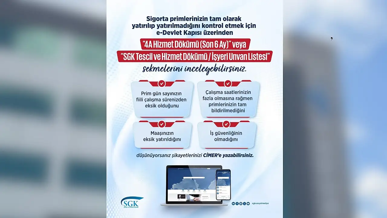 Prim gün sayınızın fiili çalışma sürenizden eksik olduğunu, çalışma saatlerinizin fazla olmasına rağmen primlerinizin tam bildirilmediğini, maaşınızın eksik yatırıldığını, iş güvenliğinin olmadığı gibi durumlarla karşılaşılması halinde CİMER’e şikâyette bulunulabileceği belirtildi.