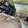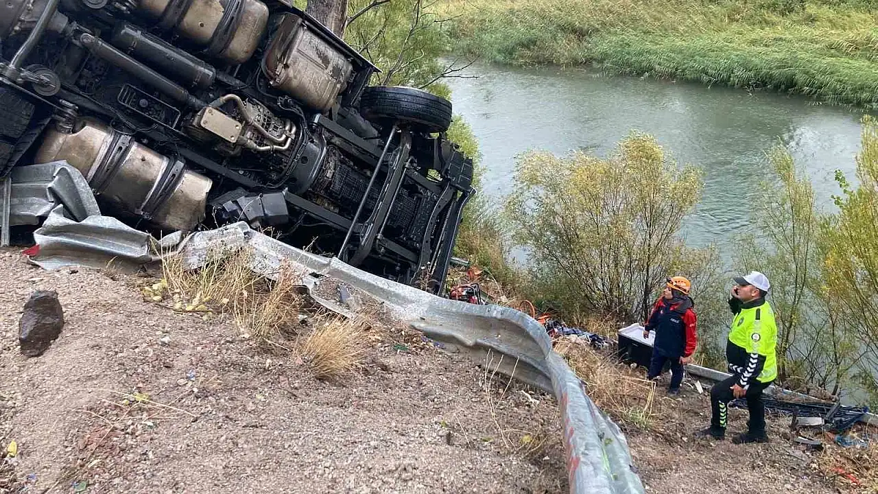 Sivas'ın Koyulhisar ilçesinde sağanak yağış, bir tır kazasına neden oldu. Sebze yüklü 31 AKZ 263 plakalı tır, sürücüsünün direksiyon hakimiyetini kaybetmesi sonucu bariyerlere çarparak Kelkit Çayı kenarına devrildi.