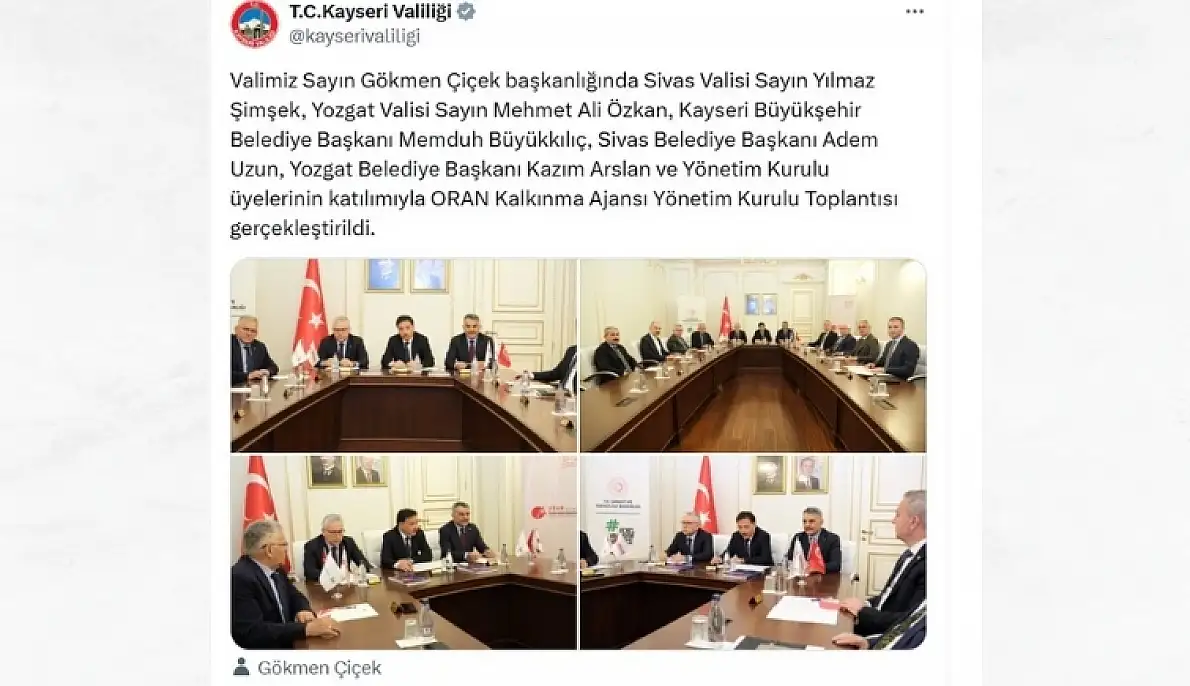 Kayseri Valisi Gökmen Çiçek başkanlığında Sivas Valisi Sayın Yılmaz Şimşek, Yozgat Valisi Sayın Mehmet Ali Özkan, Kayseri Büyükşehir Belediye Başkanı Memduh Büyükkılıç, Sivas Belediye Başkanı Adem Uzun, Yozgat Belediye Başkanı Kazım Arslan ve Yönetim Kurulu üyelerinin katılımıyla ORAN Kalkınma Ajansı Yönetim Kurulu Toplantısı gerçekleştirildi.