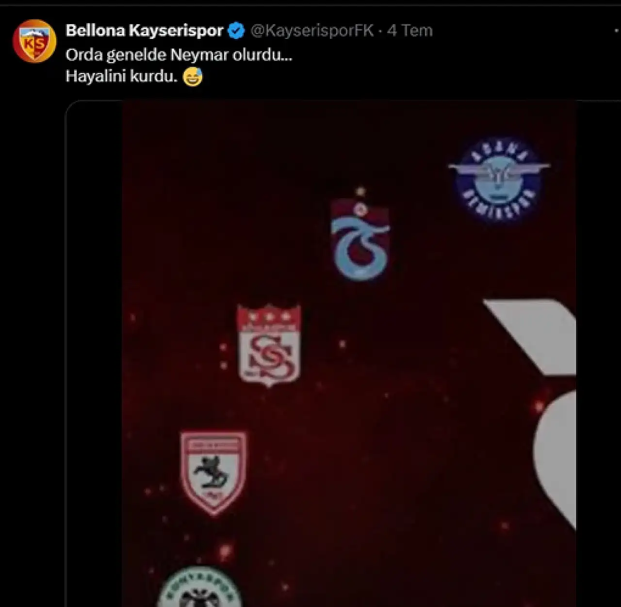Paylaşılan videoda Sivasspor logosuna doğru yaklaşan bir kadraj ve arka planda spor spikeri Ertem Şener’in yıllar önce bir maçta söylediği ve akım haline gelen ‘Orada Neymar olurdu’ sözleri yer aldı. Kayserispor ise yaptığı paylaşımda, ‘Orada genelde Neymar olurdu… Hayalini kurdu.’ ifadelerini kullandı.