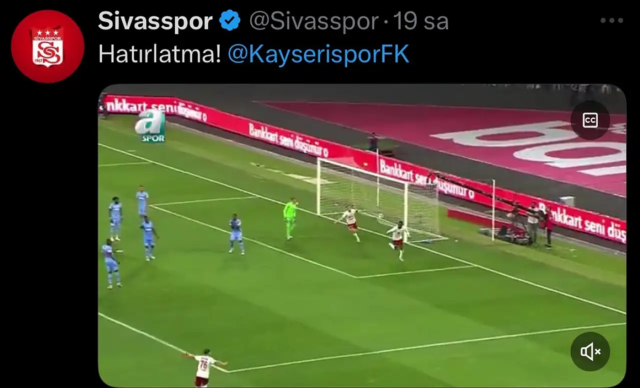 Sivasspor da Kayserispor’un bu paylaşıma cevap olarak başka bir paylaşım yaptı. Kırmızı beyazlı ekip, 2022 yılında finalde Kayserispor’u yenerek kazandığı Türkiye Kupası’ndan görüntüleri “Hatırlarma” diyerek paylaştı.