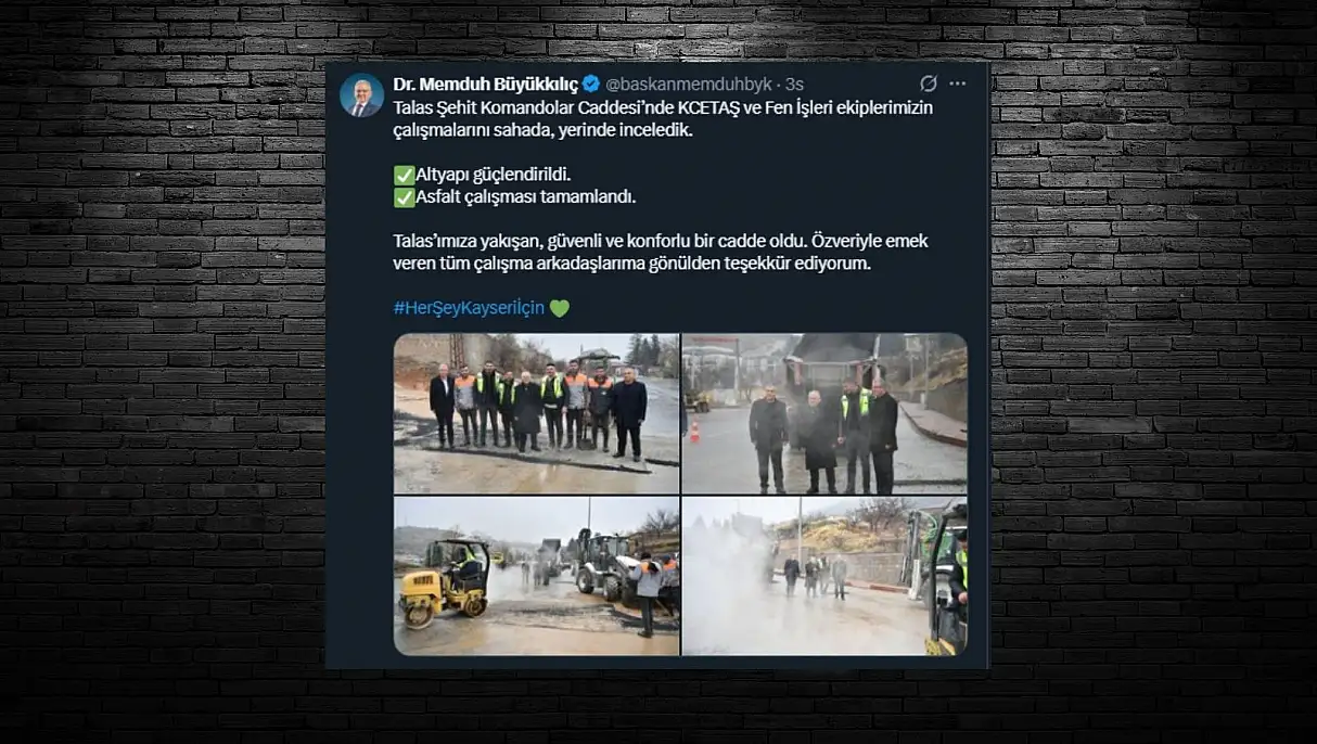 Talas Şehit Komandolar Caddesi’nde KCETAŞ ve Fen İşleri ekiplerinin çalışmalarını inceleyerek sosyal medyadan çalışma aşmaları ile ilgili kamuoyunu bilgilendiren Büyükkılıç, ‘Altyapı güçlendirildi. Asfalt çalışması tamamlandı. Talas’ımıza yakışan, güvenli ve konforlu bir cadde oldu. Özveriyle emek veren tüm çalışma arkadaşlarıma gönülden teşekkür ediyorum.’ ifadelerini kullandı.