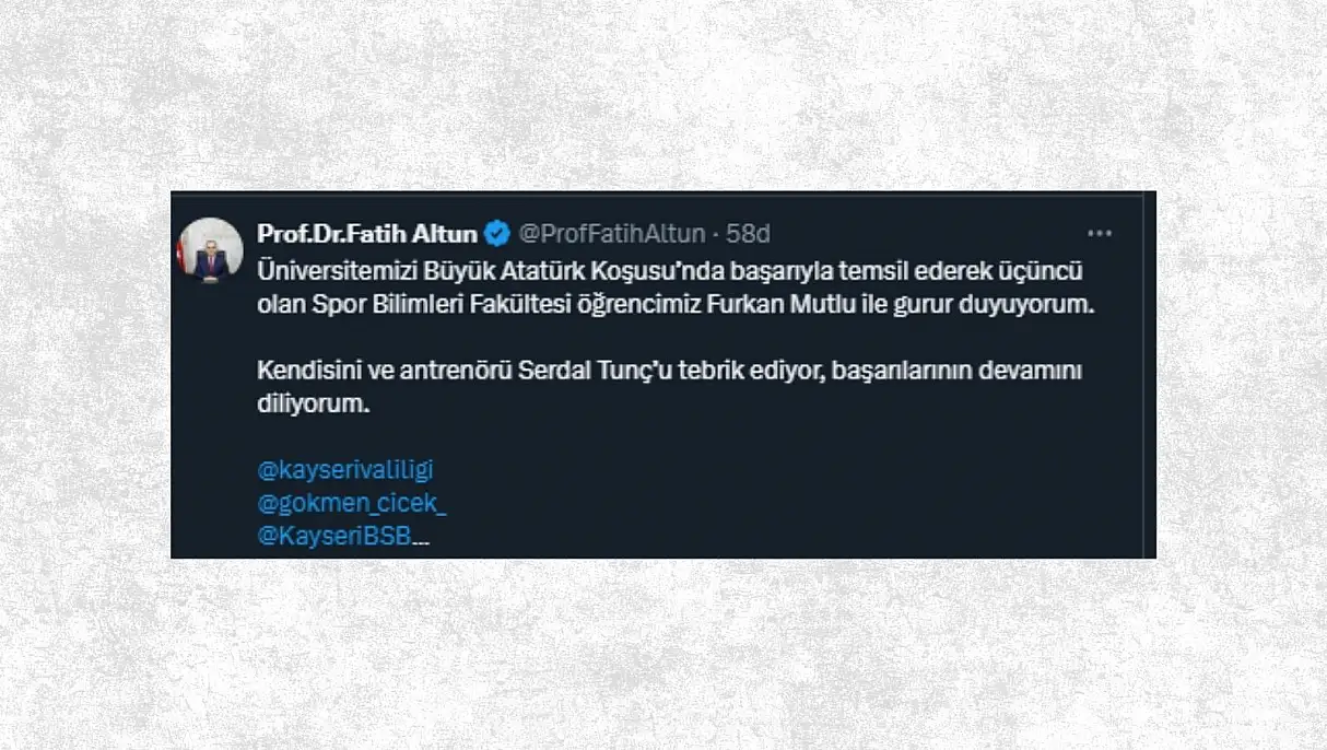 Rektör Altun, ERÜ'yü Büyük Atatürk Koşusu’nda başarıyla temsil ederek üçüncü olan Spor Bilimleri Fakültesi öğrencisi Furkan Mutlu ile gurur duyduğunu kendisini ve antrenörü Serdal Tunç’u tebrik ettiğini belirtti.