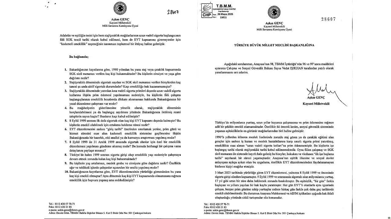 CHP Kayseri Milletvekili Aşkın Genç, staj ve çıraklık döneminde SGK sicil numarası verilmesine rağmen emeklilikte bu sürelerin yok sayılmasını eleştirerek konuyu bir kez daha Türkiye Büyük Millet Meclisi’ne taşıdı. Genç, ‘‘Aynı iş yerinde aynı prim ödenmiş, sadece birkaç gün farkla 17 yıl daha bekleyen insanlar var. Bu durum hem adil değil hem de sosyal devlet anlayışıyla bağdaşmıyor’‘ dedi.