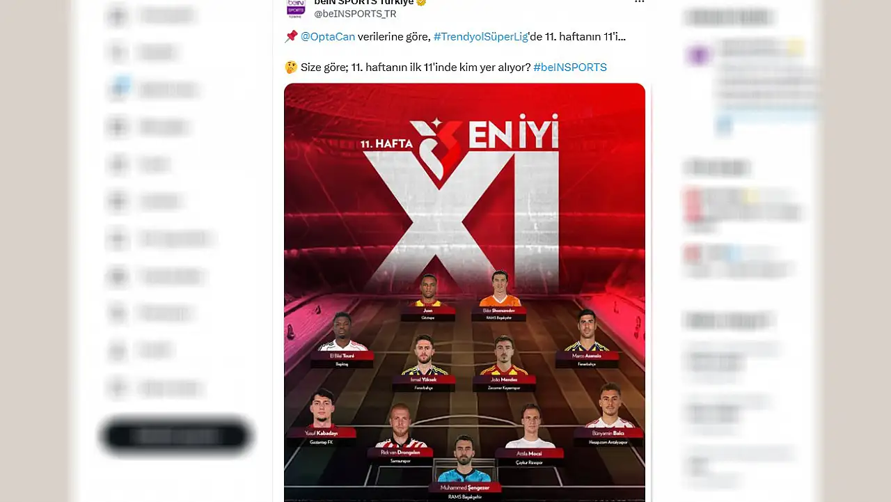 BeİNsport’un haftanın karması şu şekilde açıklandı: Muhammed Şengezer (Rams Başakşehir) - Defans oyuncuları: Juan (Gaziantep FK), Atilla Mörsi (Çaykur Rizespor), Rick van Drongelen (Samsunspor), Bünyamin Balcı (Hesapcom Antalyaspor) - Orta saha oyuncuları: İsmail Yüksek (Fenerbahçe), Joao Mendes (Kayserispor), Marco Asensio (Fenerbahçe), Yusuf Kabadayı (Gaziantep FK) - Forvet oyuncuları: Eldor Shomurodov (Rams Başakşehir), El Bilal Toure (Beşiktaş) Kayserispor’un Joao Mendes’i, BeİNsport tarafından haftanın 11’ine seçilerek, oyuncunun performansı ve takıma katkısı bir kez daha ödüllendirmiş oldu.