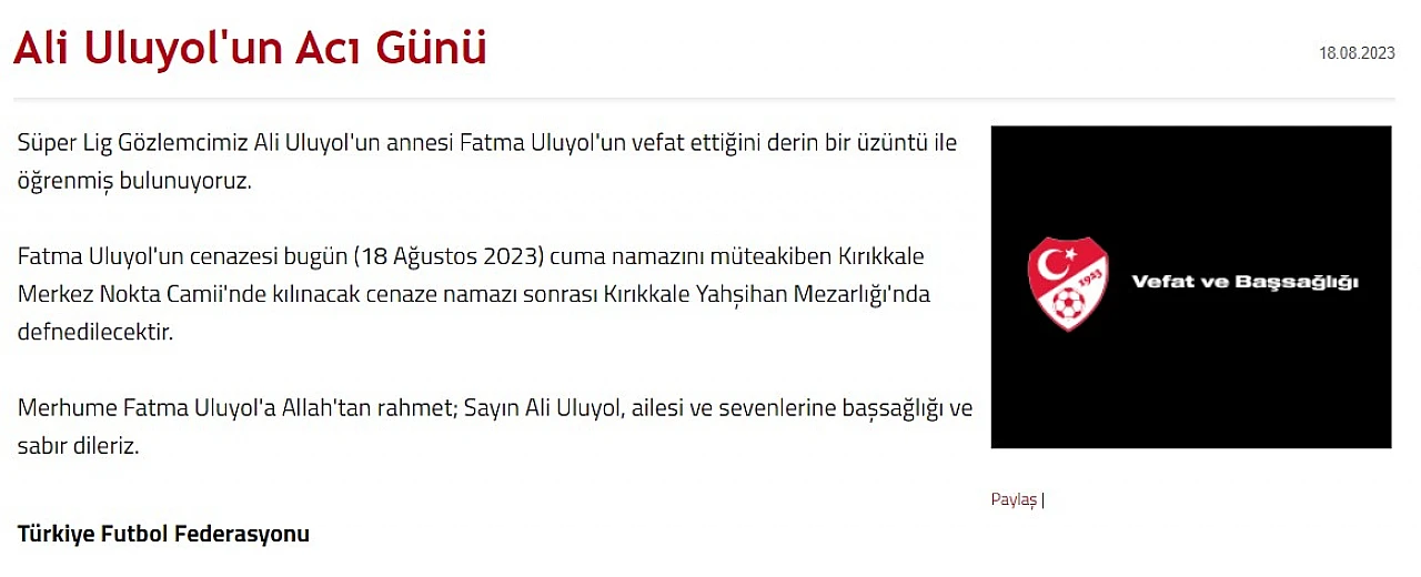 Türkiye Futbol Federasyonu da taziye mesajı yayımladı. TFF'den yapılan açıklamada şu ifadelere yer verildi; Süper Lig Gözlemcimiz Ali Uluyol'un annesi Fatma Uluyol'un vefat ettiğini derin bir üzüntü ile öğrenmiş bulunuyoruz. Fatma Uluyol'un cenazesi bugün (18 Ağustos 2023) cuma namazını müteakiben Kırıkkale Merkez Nokta Camii'nde kılınacak cenaze namazı sonrası Kırıkkale Yahşihan Mezarlığı'nda defnedilecektir. Merhume Fatma Uluyol'a Allah'tan rahmet; Sayın Ali Uluyol, ailesi ve sevenlerine başsağlığı ve sabır dileriz.