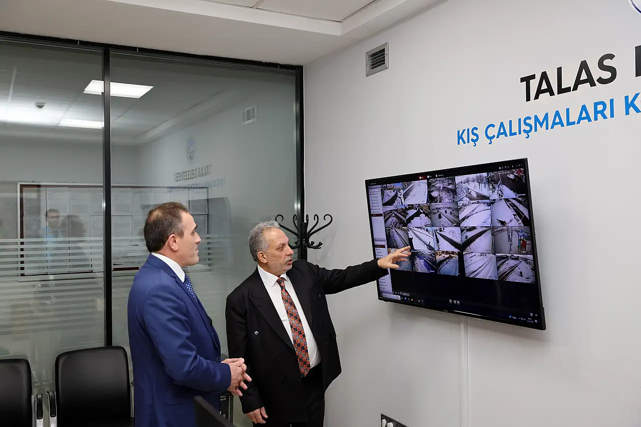 Talas Belediye Başkanı Mustafa Yalçın ile İlçe Kaymakamı İlyas Memiş, belediye hizmet binası içerisinde bulunan Kış Çalışmaları Koordinasyon Merkezinde incelemelerde bulunarak yürütülen çalışmaları yerinde değerlendirdi.