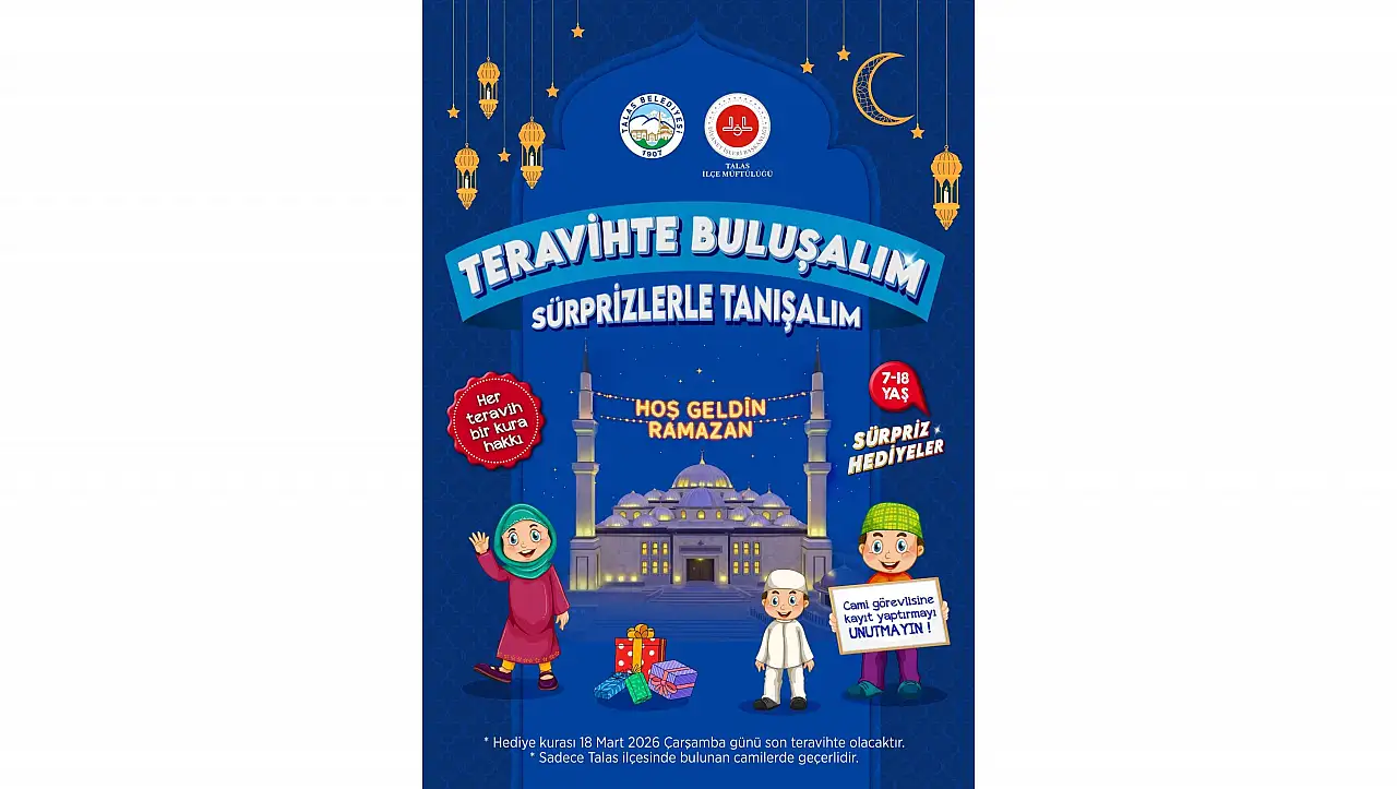 Talas Belediyesi ile Talas İlçe Müftülüğü iş birliğinde Ramazan ayına özel anlamlı bir etkinlik hayata geçiriliyor. 'Teravihte Buluşalım, Sürprizlerle Tanışalım' sloganıyla düzenlenen program kapsamında çocuklar, teravih namazlarında camilerde hem manevi atmosferi yaşayacak hem de birbirinden güzel sürpriz hediyelerle buluşacak. Detaylar haberimizde...