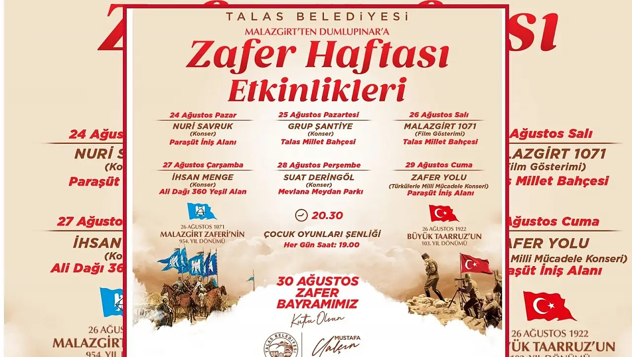 ’Malazgirt’ten Dumlupınar’a’ adıyla organize edilen takvim kapsamında Talas’ın farklı noktalarında konserden film gösterimlerine, çocuk oyun şenliğinden animasyonlara kadar bir dizi program gerçekleştirilecek. 24 Ağustos Pazar günü başlayacak etkinliklerde ilk olarak Yamaç Paraşütü İniş Alanında rock sanatçısı Nuri Savruk sahne alacak.