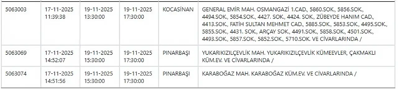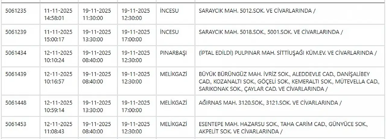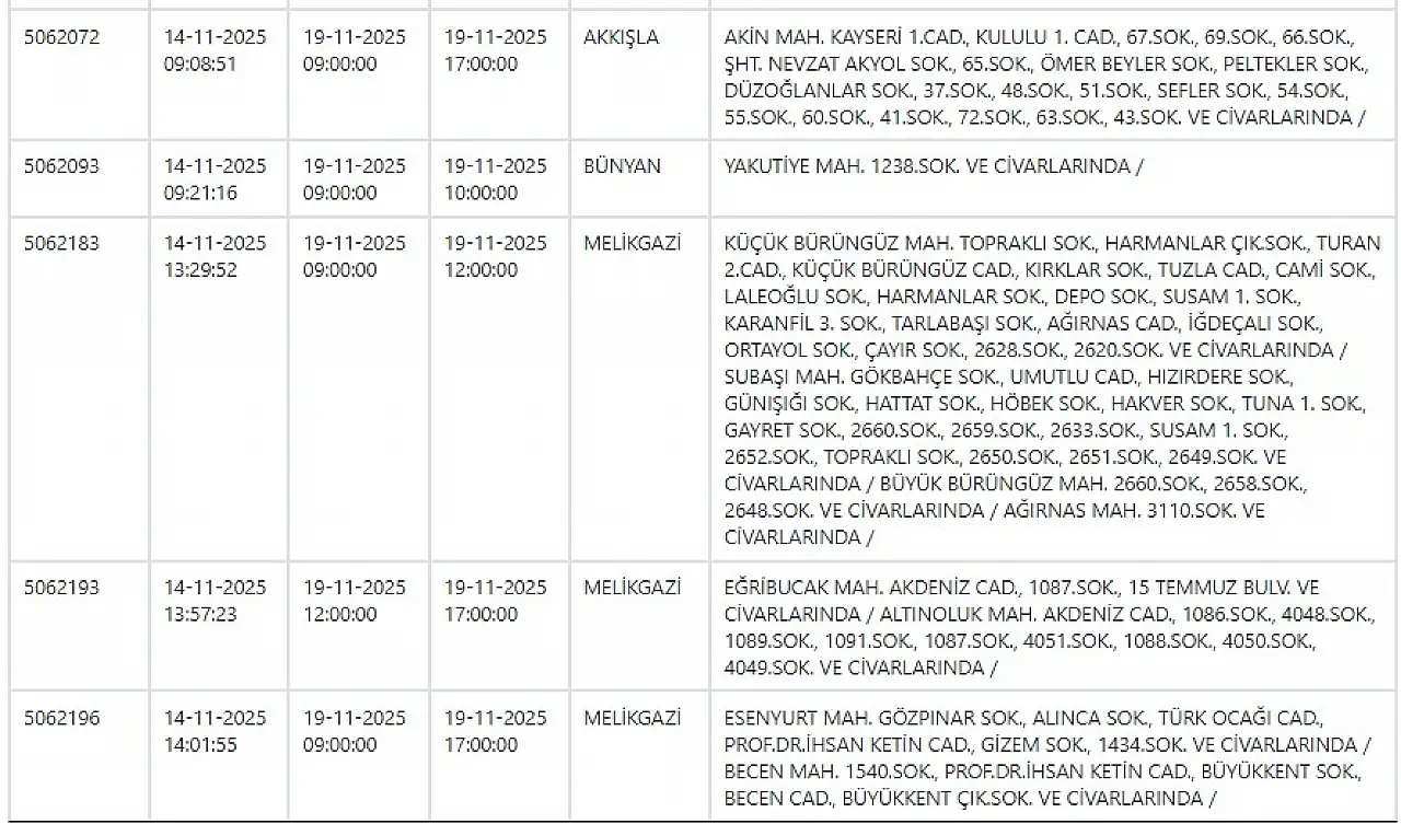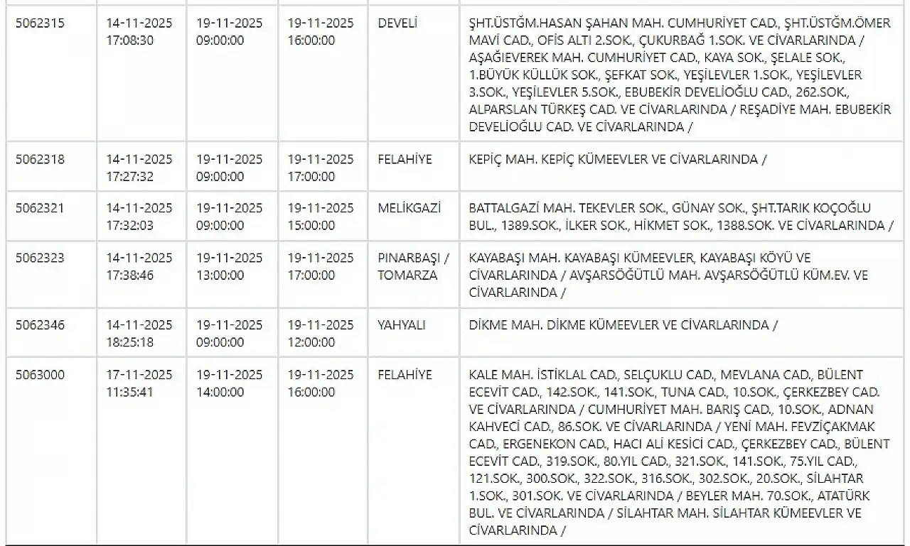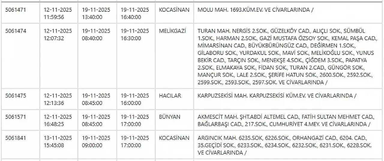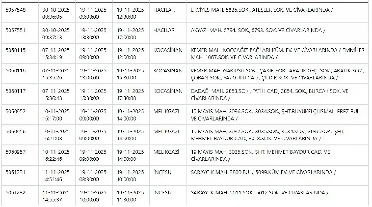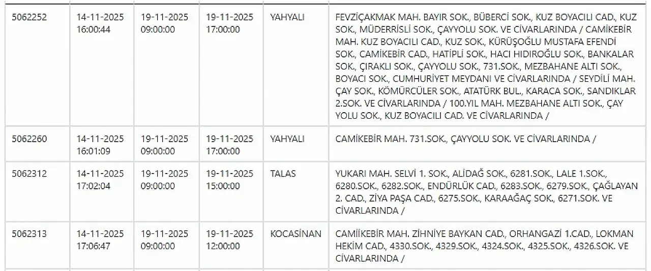 KCETAŞ’tan edinilen bilgilere göre yarın (19 Kasım 2025) aşağıdaki ilçe ve mahallelerde elektrik kesintisi yaşanacak.