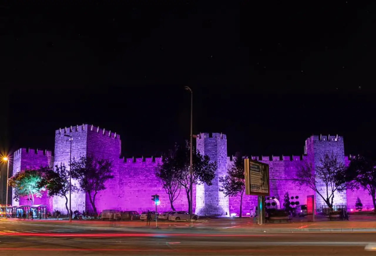 Kayseri İl Sağlık Müdürlüğü tarafından yapılan paylaşımda Kayseri Kalesi'nin Kanserle Mücadelede anlamlı renklerden olan mor renk ile aydınlatıldığı belirtildi.