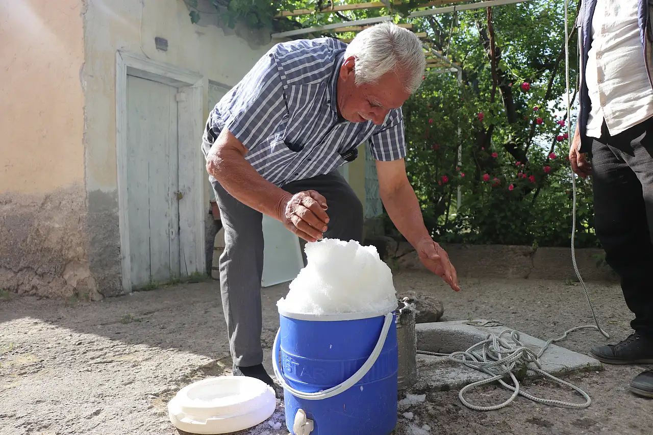 ‘‘Amcam bize, ‘Oğlum bu geleneği bırakmayın, devam edin’ dedi. O vefat etti ama biz her kış çocuklarıyla birlikte toplanıp kar toplarız. Kuyulara basarız. Yaz gelince de isteyen herkese kapımız açık. Poşetleyip veririz. Parayla değil, sebil gibi. Gelen memnun gider.’‘