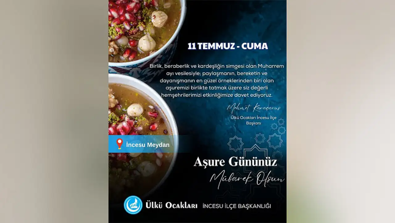 İncesu Ülkü Ocakları 11 Temmuz Cuma günü İncesu Meydanı’nda aşure dağıtım etkinliği gerçekleştirilecek. Etkinliği duyuran Ülkü Ocakları İlçe Başkanı Mehmet Karaçavuş, ‘’Birlik, beraberlik ve kardeşliğin simgesi olan Muharrem ayı vesilesiyle; paylaşmanın, bereketin ve dayanışmanın en güzel örneklerinden biri olan aşuremizi birlikte tatmak üzere siz değerli hemşerilerimizi etkinliğimize davet ediyoruz.‘’ ifadelerini kullandı.