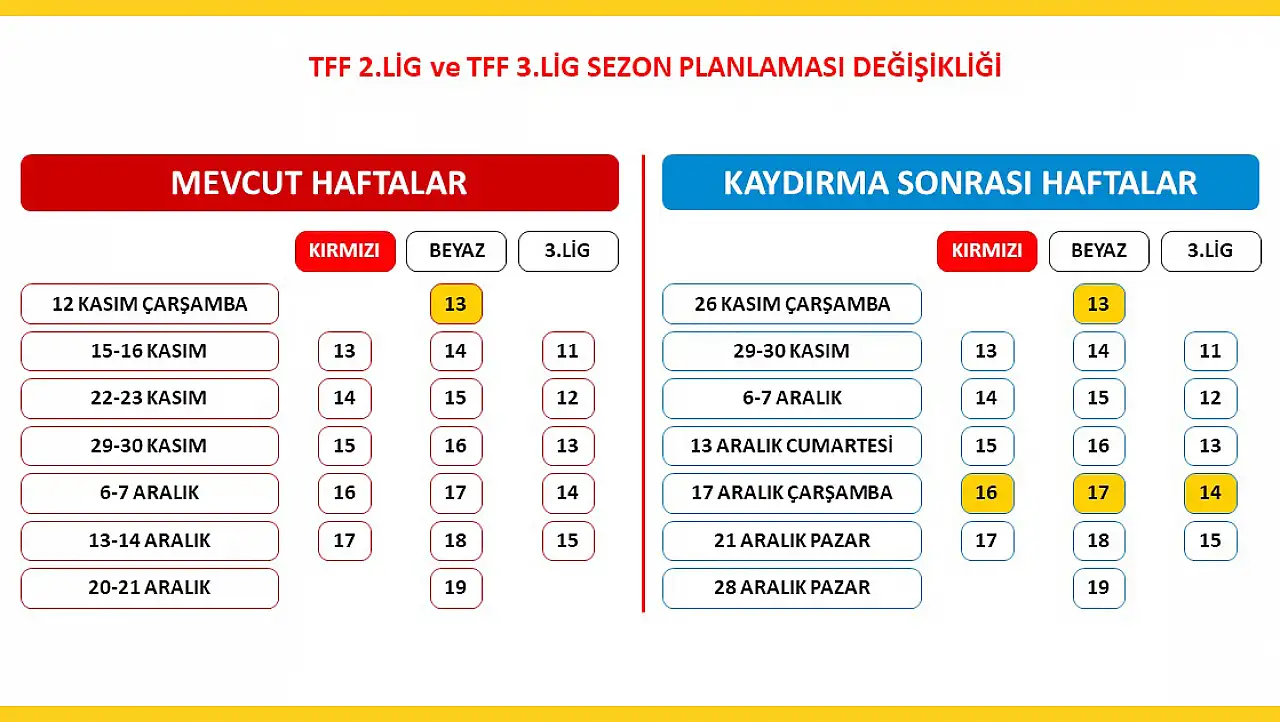 TFF’den yapılan açıklamada, “Türkiye Futbol Federasyonu Yönetim Kurulu'nun TFF 2. Lig ve TFF 3. Lig'in iki hafta kaydırılması kararı doğrultusunda, ilk devrenin sonuna kadar oynanacak olan haftalar için belirlenen müsabaka takvimi değişti. Değişen tarihlere göre düzenlenmiş yeni müsabaka programları daha sonra ilan edilecektir” ifadeleri kullanıldı.