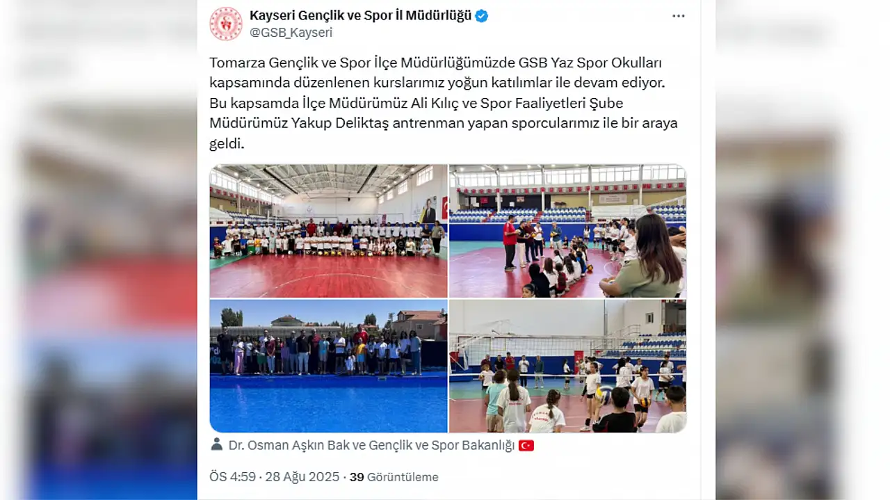 Kayseri Gençlik ve Spor İl Müdürlüğü tarafından yapılan paylaşımda: ‘’Tomarza Gençlik ve Spor İlçe Müdürlüğümüzde GSB Yaz Spor Okulları kapsamında düzenlenen kurslarımız yoğun katılımlar ile devam ediyor. Bu kapsamda İlçe Müdürümüz Ali Kılıç ve Spor Faaliyetleri Şube Müdürümüz Yakup Deliktaş antrenman yapan sporcularımız ile bir araya geldi'' ifadelerine yer verildi.