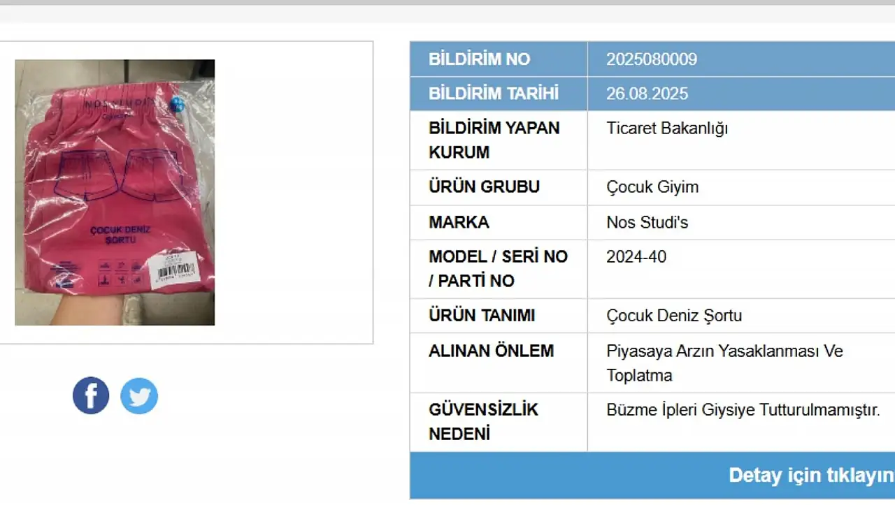 Nos Studıo Tekstil Sanayi Ticaret Anonim Şirketi firmasına ait Collection Çocuk Deniz Şortu ürün toplatılıyor. Güvensizlik nedeni ‘’Büzme İpleri Giysiye Tutturulmamıştır.’’ şeklinde açıklanan ürüne piyasaya arzın yasaklanması ve toplatma kararı verildi.