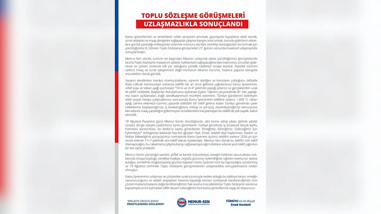 Kamu işveren tarafının son teklifi 2026 yılı ilk yarısı için yüzde 11, ikinci altı ayı için ise yüzde 7 olmuştu. Heyet, 2027 yılı için ise 4+4 zam teklifinde bulunmuştu. Memur-Sen ise teklifi yeterli görmediğini belirtmişti.