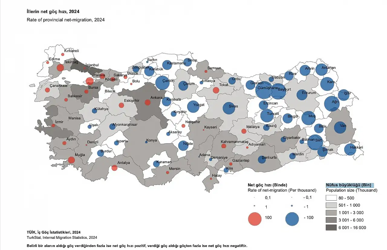 Türkiye İstatistik Kurumu’nun (TÜİK) 2024 yılına ilişkin iç göç verileri açıklandı ve Türkiye genelinde nüfus hareketliliğinin yönü ve etkisi ortaya çıktı. Hazırlanan harita üzerinde illerin net göç hızları daire büyüklükleriyle görselleştirildi. Her ilin göç alıp almadığı veya göç verip vermediği net bir şekilde işaretlendi.