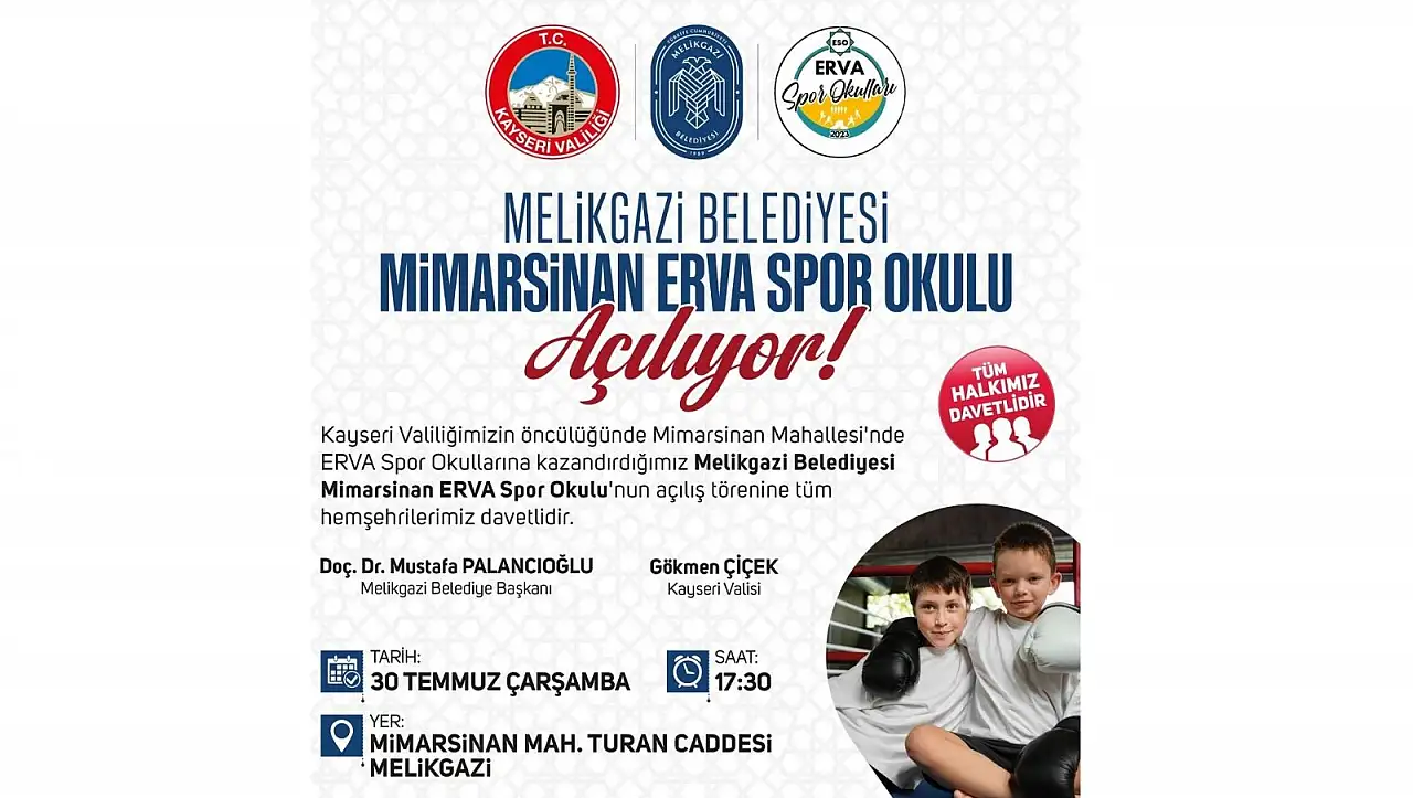 Kayseri Valiliği öncülüğünde başlatılan ‘ERVA Spor Okulları’ projesi Melikgazi ilçesinde bulunan Mimarsinan Mahallesi’ne açılıyor. Tüm Kayserililerin davet edildiği açılış töreninde Kayseri’nin 58’inci ERVA Spor Okulu açılacak. Melikgazi Belediyesi Mimarsinan ERVA Spor Okulu 30 Temmuz Çarşamba (yarın) saat 17.30’da törenle açılacak.