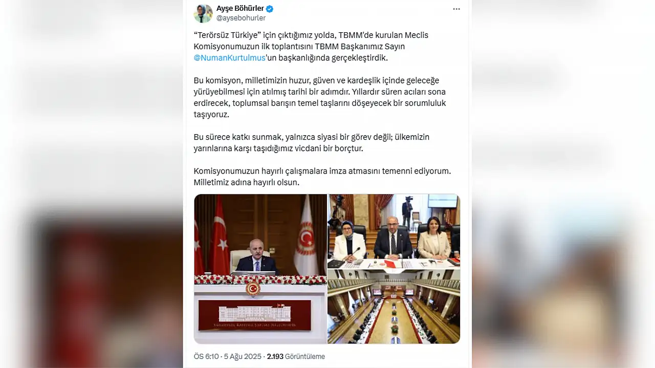 Komisyon çalışmalarının birlik ve beraberlik için tarihi bir adım olduğunun altını çizen Vekil Böhürler, ‘’Terörsüz Türkiye'' için çıktığımız yolda, TBMM'de kurulan Meclis Komisyonumuzun ilk toplantısını TBMM Başkanımız Sayın Numan Kurtulmuş'un başkanlığında gerçekleştirdik. Bu komisyon, milletimizin huzur, güven ve kardeşlik içinde geleceğe yürüyebilmesi için atılmış tarihi bir adımdır'' ifadelerini kullandı.