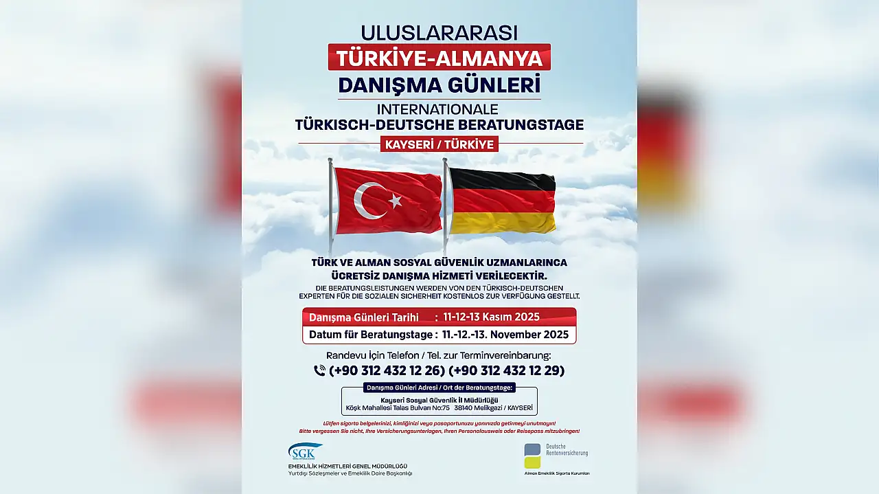 arasında imzalanan protokol çerçevesinde 11-12-13 Kasım 2025 tarihlerinde SGK Kayseri Sosyal Güvenlik İl Müdürlüğü Hizmet Binasında Türkiye – Almanya Danışma Günleri düzenleneceği belirtildi.