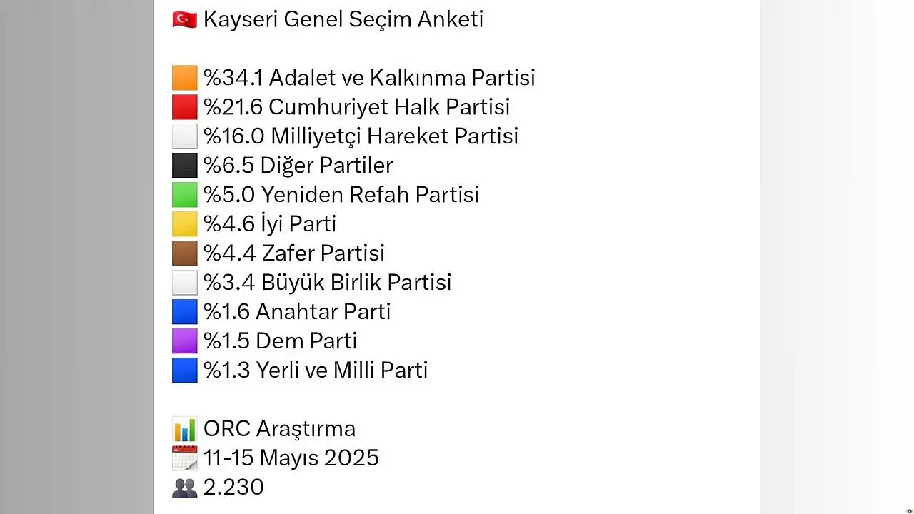 ORC Araştırma’nın 11-15 Mayıs 2025 tarihleri arasında Kayseri’de gerçekleştirdiği anket çalışmasına göre, kentteki oy dağılımı şöyle oldu: