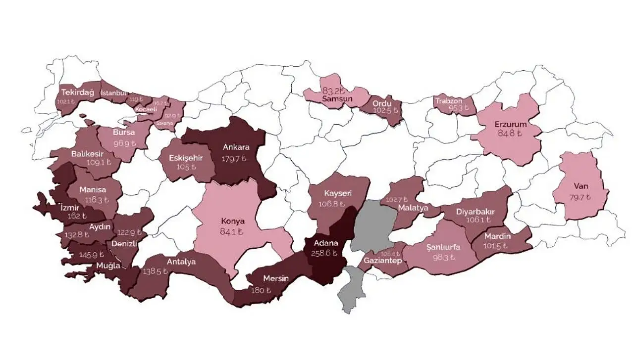 İllerin fiyat dağılımına bakıldığında, Adana yine en pahalı il olarak öne çıktı ve ortalama 258,6 TL’ye ulaştı. Mersin 180 TL, Ankara 179,7 TL, İzmir 162 TL ve Muğla 145,9 TL ile takip etti. Antalya 138,5 TL, Aydın 132,8 TL, Denizli 122,9 TL ve İstanbul 119 TL seviyesinde yer aldı.