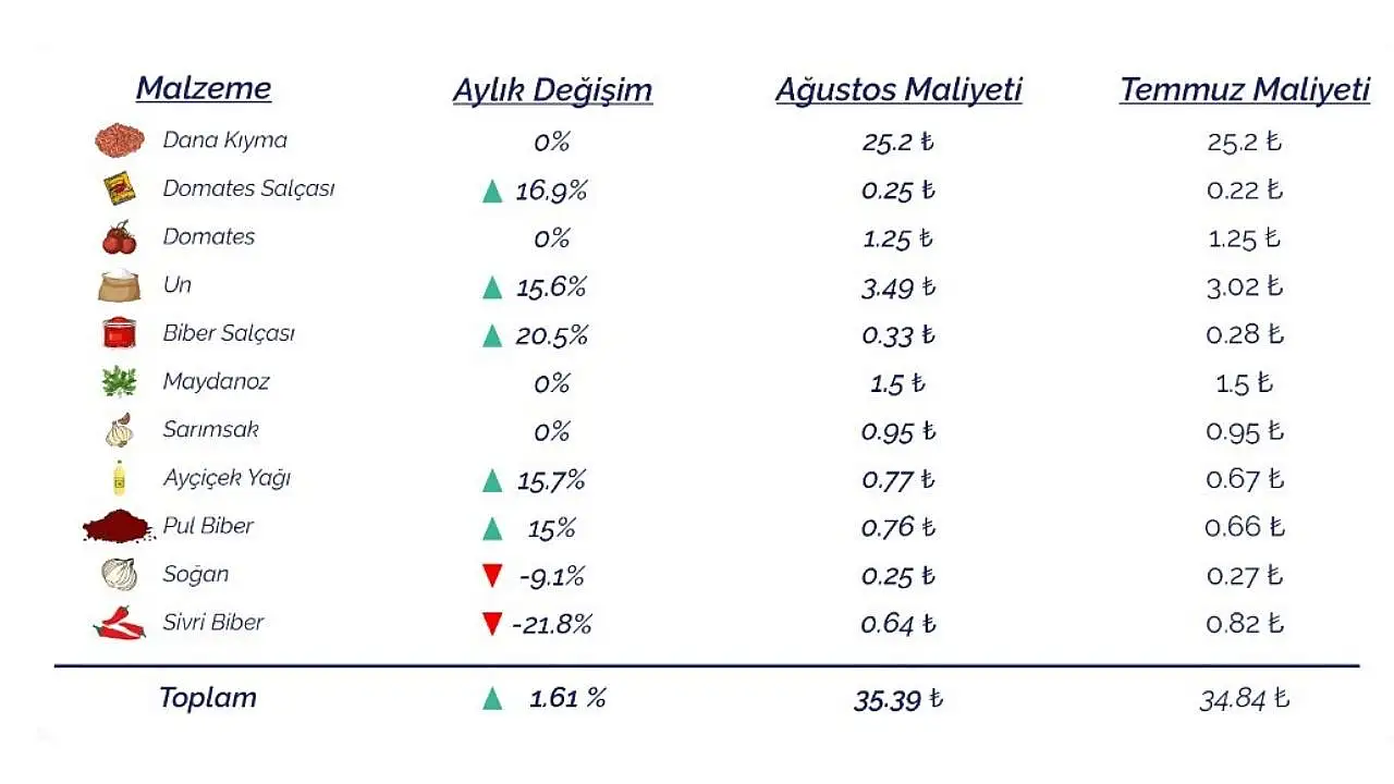 Maliyet artışlarında en büyük etkenler arasında un, salçalar ve yağ öne çıkıyor. Temmuz-ağustos döneminde un fiyatı yüzde 15,6, domates salçası yüzde 16,9, biber salçası yüzde 20,5 ve ayçiçek yağı yüzde 15,7 arttı.